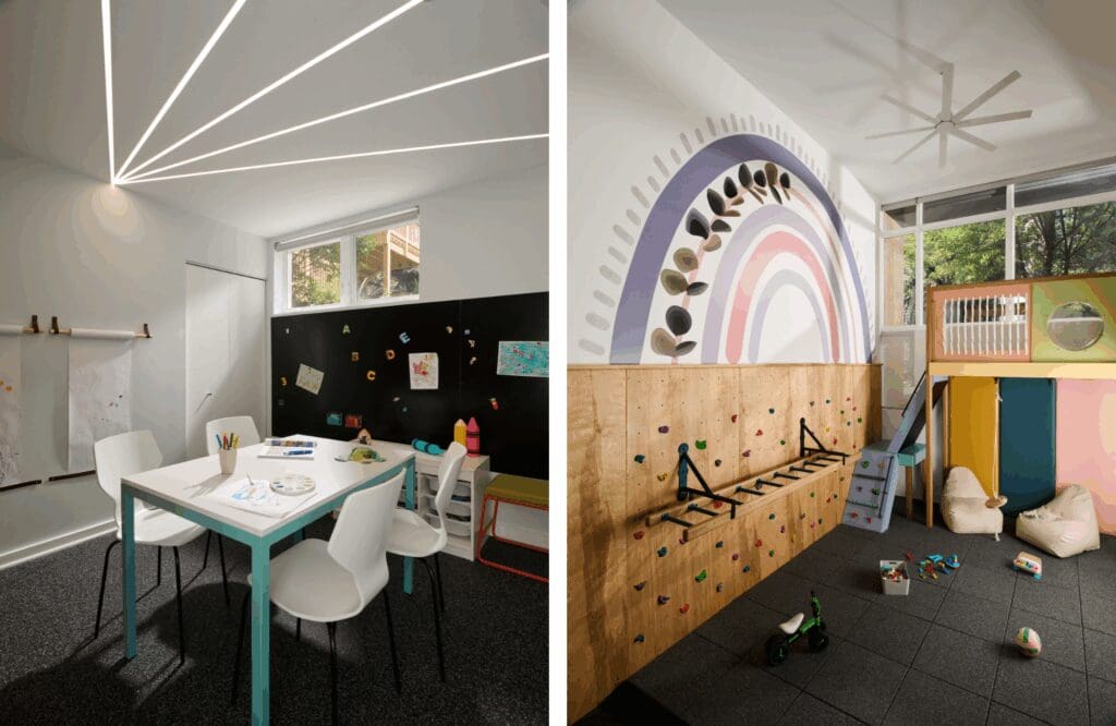 The paper airplane LED light floating across the ceiling (left). The rock wall and jungle gym with attachable swings and tiny LED lights underneath the platform that create a cozy hangout spot (right).